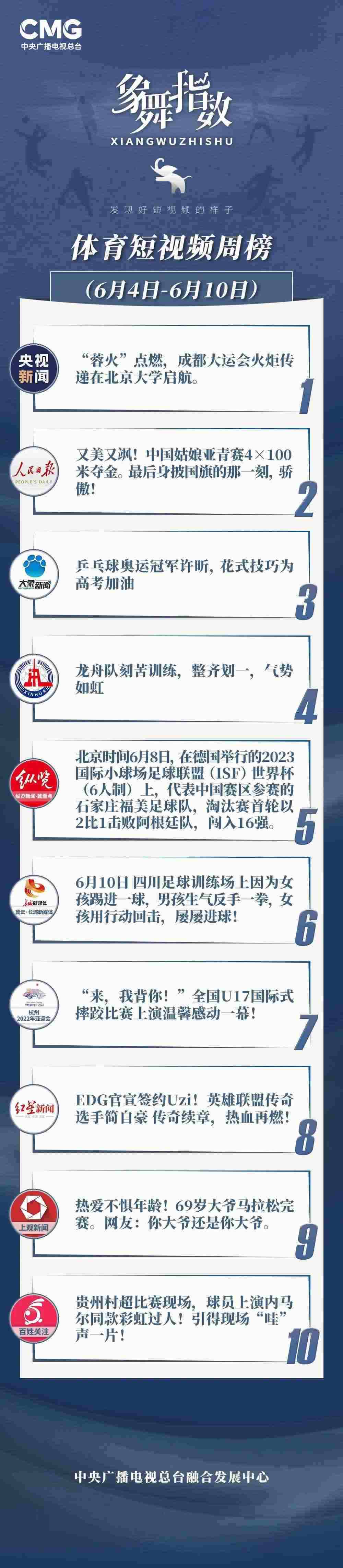 中央廣播電視總臺“象舞指數(shù)”評議品牌,推出體育短視頻周榜、總臺體育短視頻周榜。在6月4日—6月10日,以下內(nèi)容獲得矚目: