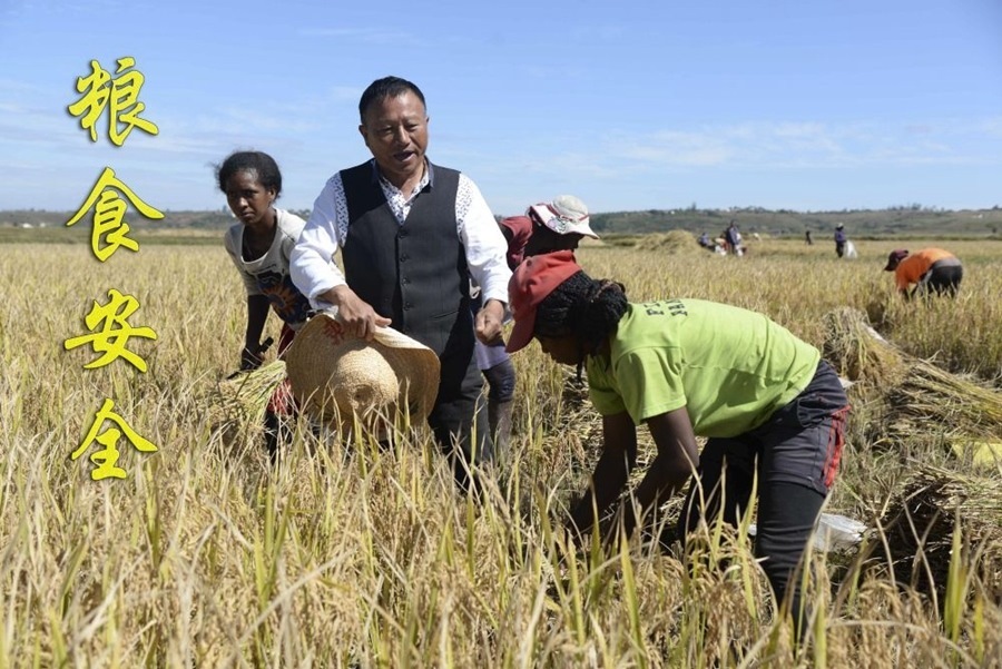 在馬達(dá)加斯加首都塔那那利佛附近的馬義奇鎮(zhèn),中國(guó)雜交水稻技術(shù)專家胡月舫(左二)在中國(guó)國(guó)家雜交水稻工程技術(shù)研究中心非洲分中心的試驗(yàn)田里和當(dāng)?shù)剞r(nóng)民交流(2023年5月12日攝)。目前,中國(guó)雜交水稻在馬達(dá)加斯加累計(jì)推廣面積已達(dá)5萬(wàn)多公頃,平均每公頃產(chǎn)量可達(dá)7.5噸左右。馬達(dá)加斯加距離實(shí)現(xiàn)糧食自給自足的目標(biāo)邁近了一大步。