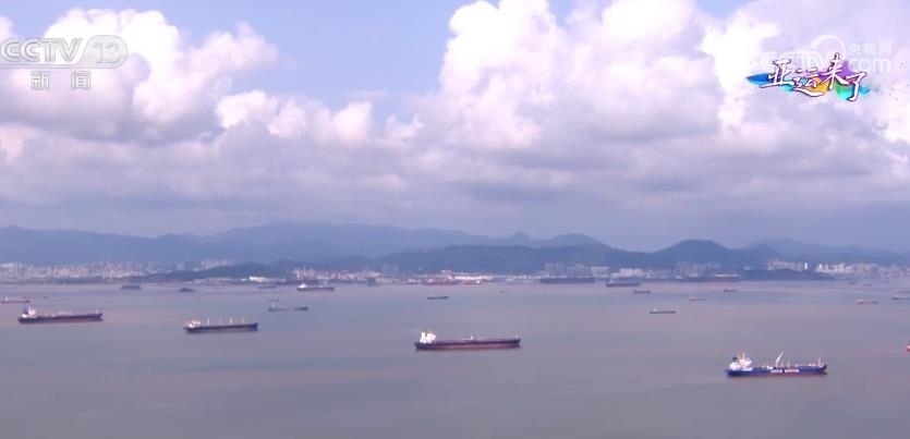 我們飛越兩座亞運場館,將要看到的就是寧波最閃亮的名片之一:寧波舟山港。繁忙是這座港口的常態(tài)。當(dāng)我們的直升機遠(yuǎn)遠(yuǎn)地飛行,還沒有靠近港口的時候,就能先看到港口外的這片海域——洋小貓水域,這里是船舶經(jīng)南航道進(jìn)出寧波舟山港核心港區(qū)的一條必經(jīng)之路。向下看,大家可以看到海面上星星點點的船只,來自全球各地滿載商品貨物的遠(yuǎn)洋船舶在這里交匯。