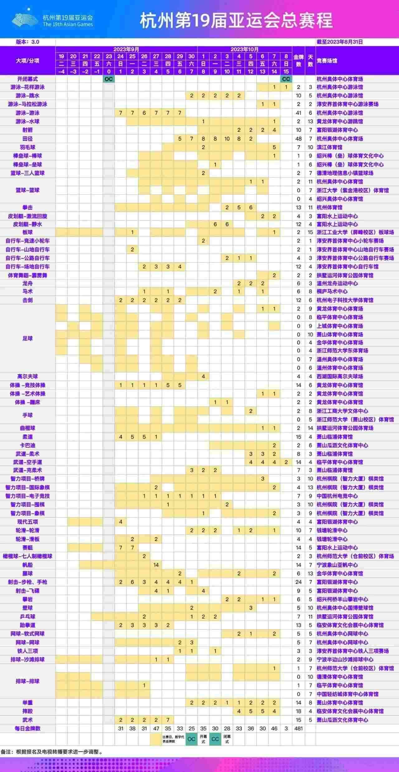 根據(jù)最新報(bào)名調(diào)整情況,經(jīng)杭州亞運(yùn)會(huì)各項(xiàng)目技術(shù)代表確認(rèn),杭州亞運(yùn)會(huì)總賽程已更新至3.0版。
