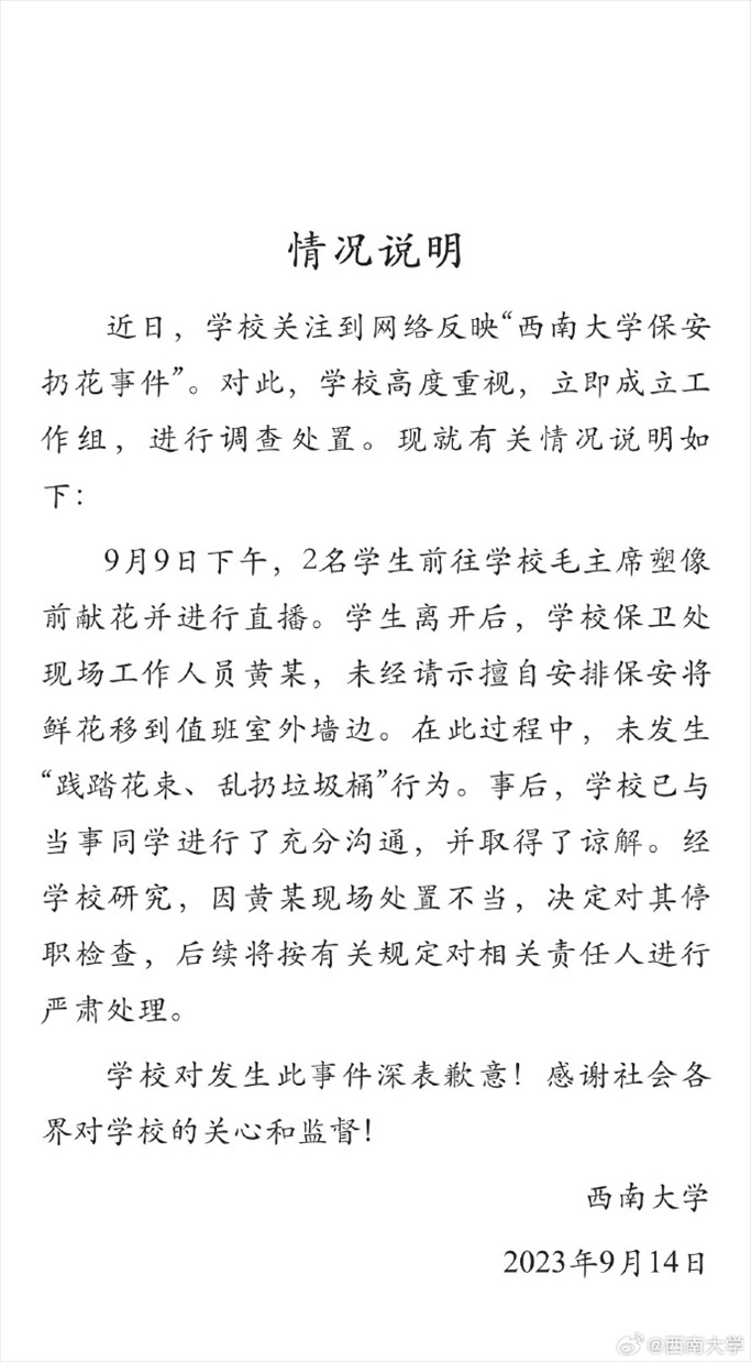 ·西南大學通報“保安扔花事件”:工作人員處置不當,決定對其停職檢查。