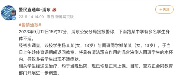·上海警方通報“中學生在校投放不明物質(zhì)致同學飲用后送醫(yī)”。