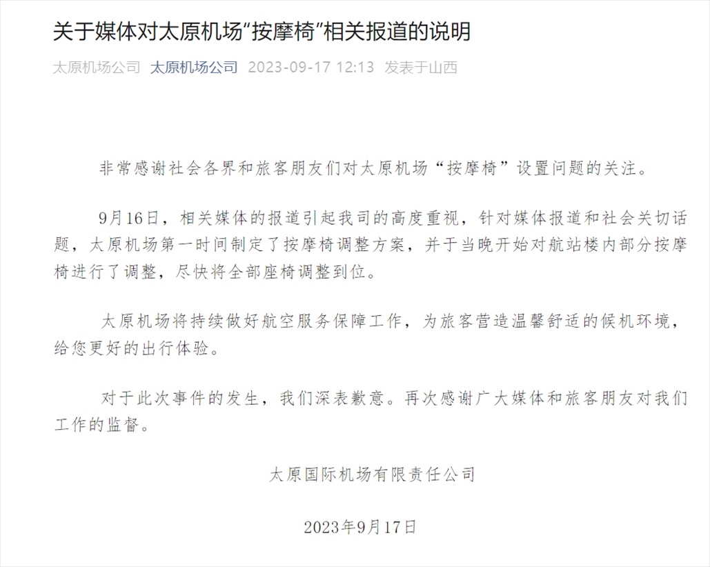 ·太原機(jī)場(chǎng)回應(yīng)“部分登機(jī)口全是按摩椅”:將在19日調(diào)整完畢。
