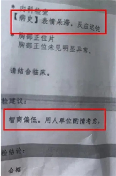 ·江蘇一醫(yī)院體檢報(bào)告上寫(xiě)“智商偏低,用人單位酌情考慮”?涉事醫(yī)院回應(yīng):屬實(shí),主檢醫(yī)生已被停職。