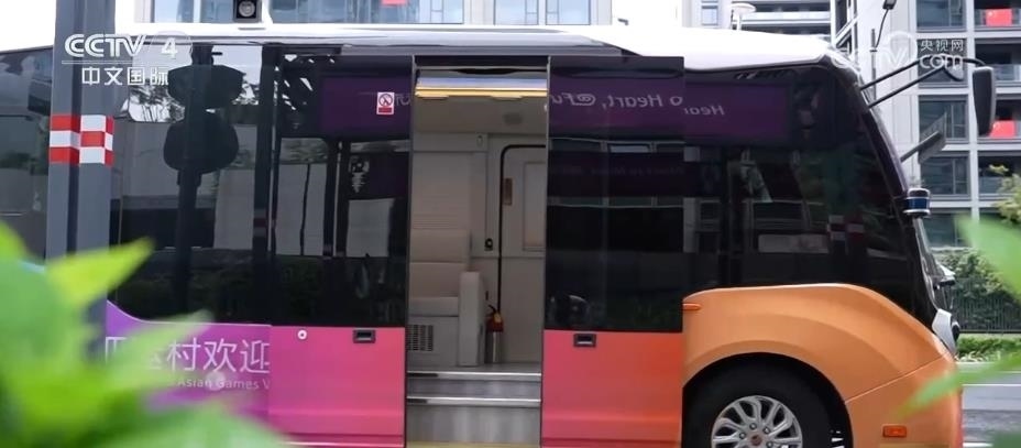 總臺記者 黃珊:亞運村里的AR智能巴士在全自動巡航狀態(tài)下,能為乘客提供接駁、講解的服務。正前方的特殊窗戶結(jié)合車載AR功能,透過它能夠看到車外的實時影像,結(jié)合虛擬場景,虛實結(jié)合,非常奇妙。