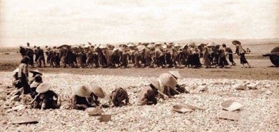 △抗戰(zhàn)期間,中國民工手搬石塊、肩拉石碾修筑機(jī)場(chǎng)。(資料圖片)