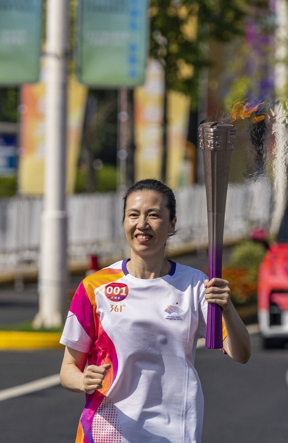 ↑火炬手司燁儀在火炬?zhèn)鬟f中。