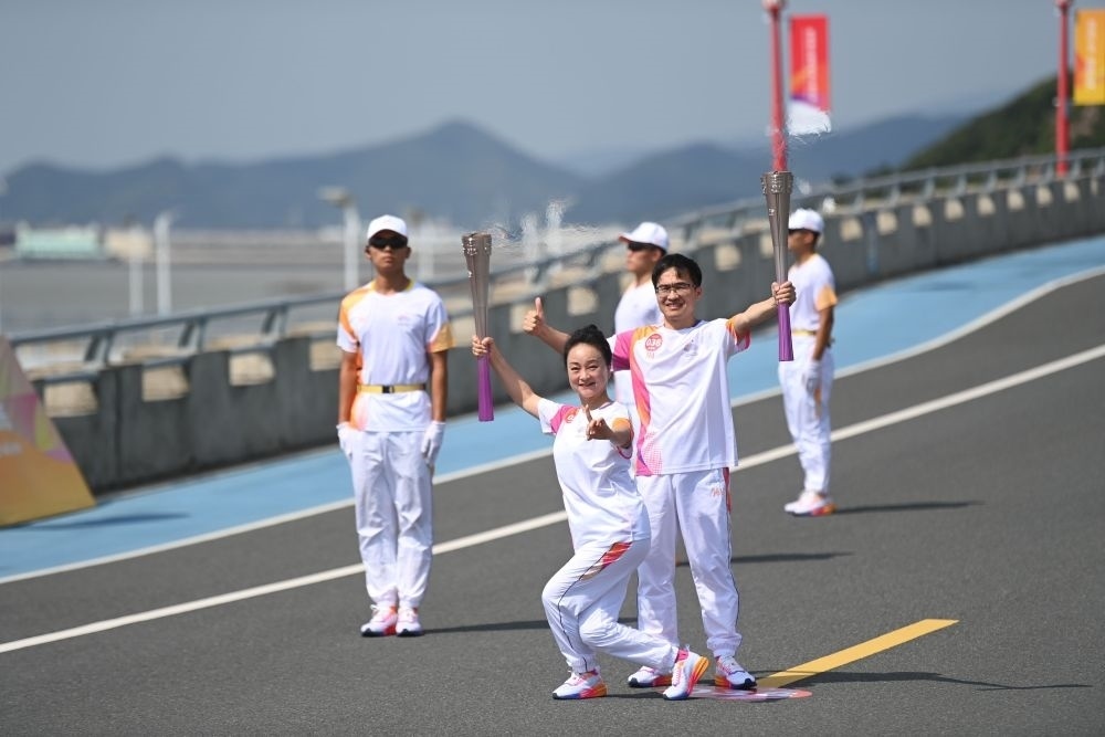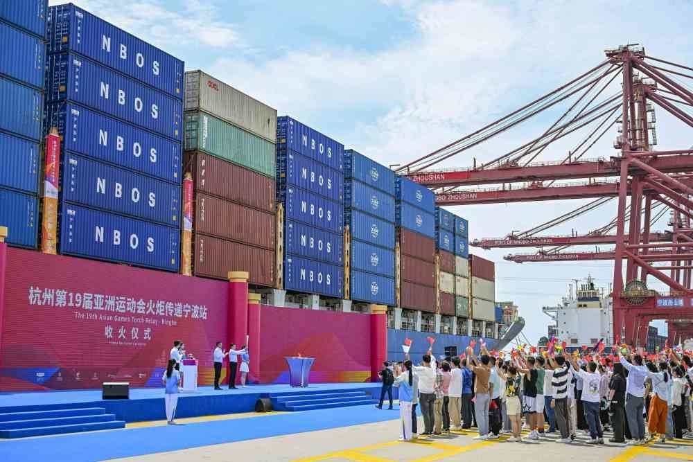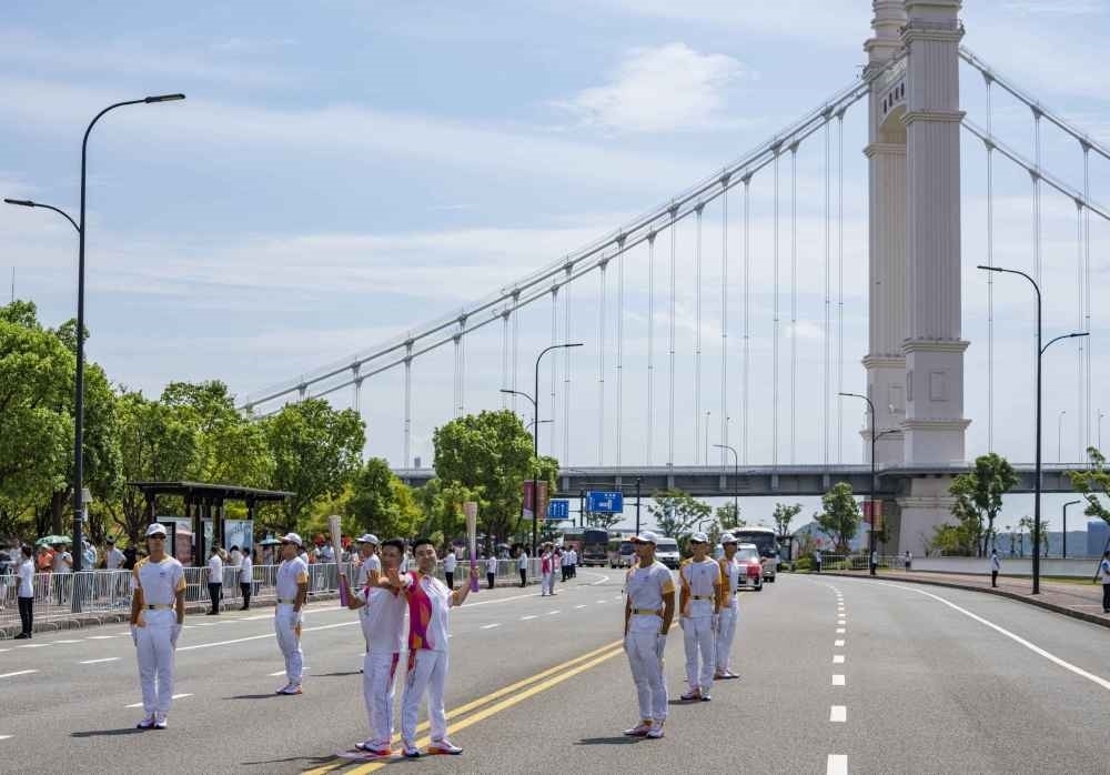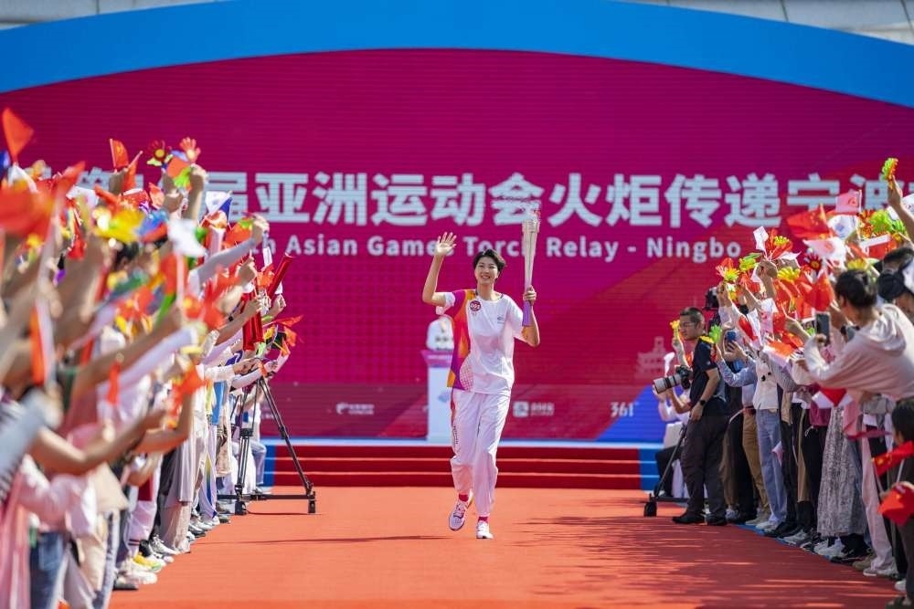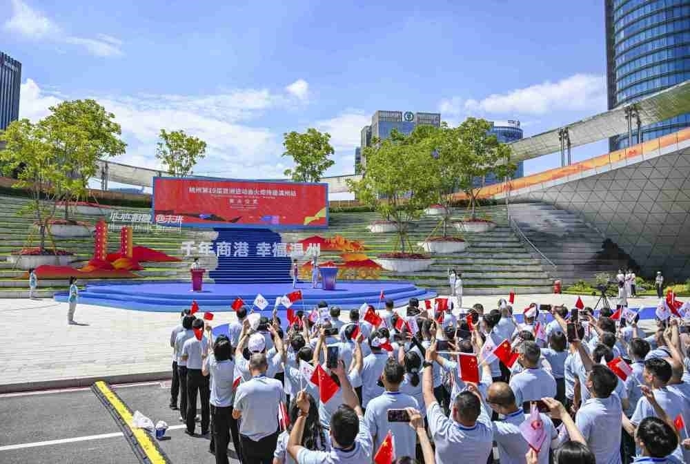 ↑這是杭州亞運(yùn)會(huì)火炬?zhèn)鬟f寧波站起跑儀式現(xiàn)場(chǎng)。
