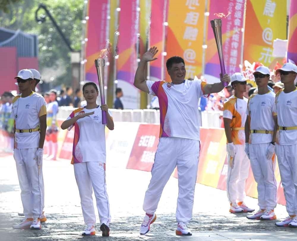 ↑火炬手王子震(右)和項(xiàng)珍珍在火炬?zhèn)鬟f中。