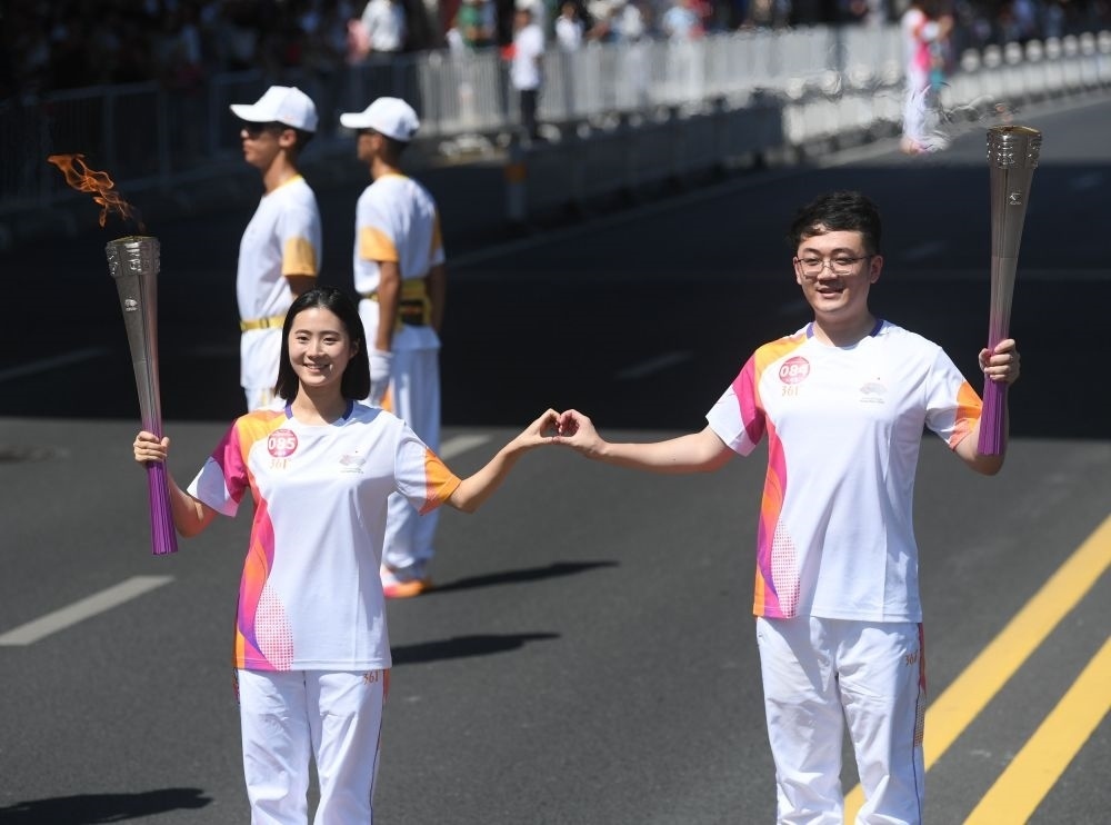 ↑火炬手葛庭輝(左)和章麗楠在火炬?zhèn)鬟f中。