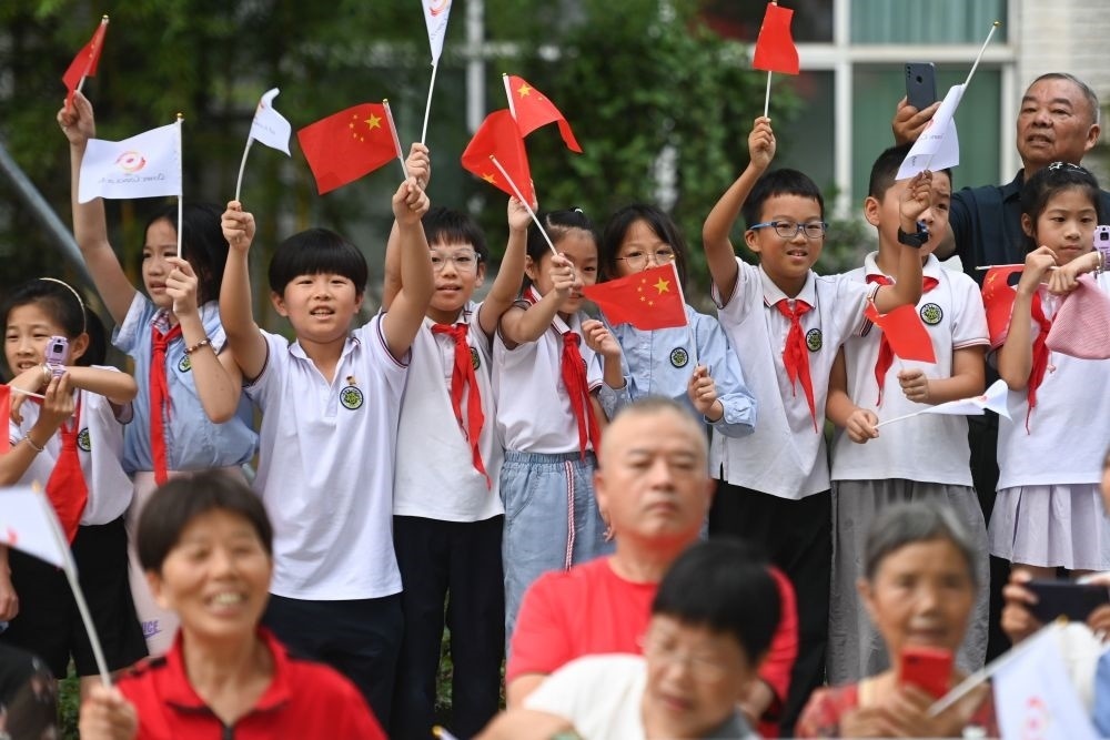 ↑小學(xué)生在路邊為火炬手助威。