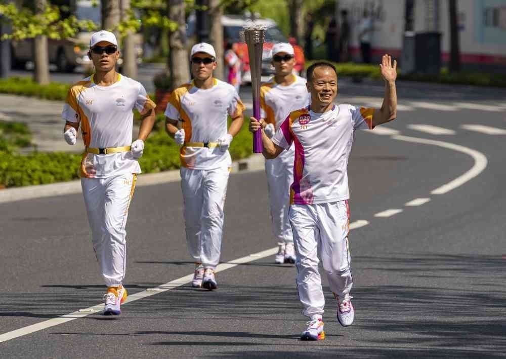 ↑火炬手湯錫強(qiáng)在火炬?zhèn)鬟f中。