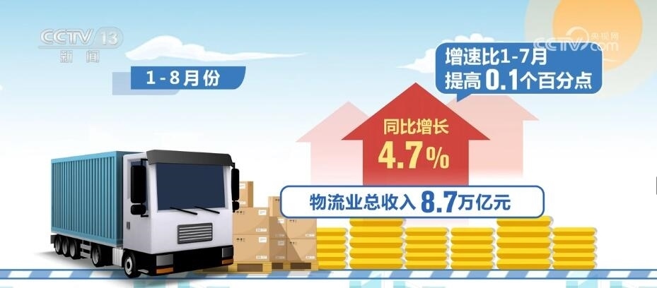 1—8月份,物流業(yè)總收入8.7萬億元,同比增長4.7%,增速比1—7月提高0.1個百分點。