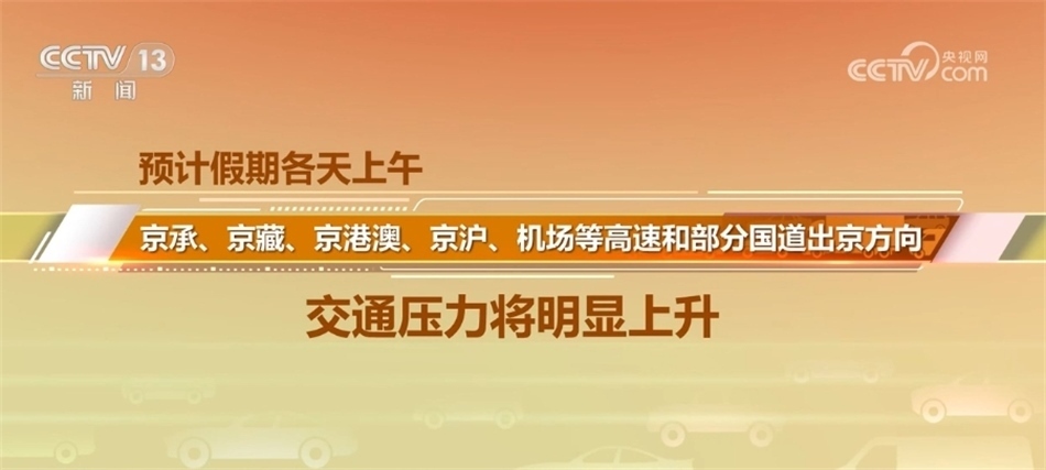 北京市交通部門表示,“雙節(jié)”假日期間,高速公路小客車免費通行、尾號不限行等措施帶動群眾出行需求集中釋放,預(yù)計中超、中網(wǎng)、演出等大型活動舉辦場地周邊道路短時車流集中,連接城區(qū)和郊區(qū)的各條高速公路將出現(xiàn)上午出京、下午進京的車流高峰,預(yù)計假期各天上午,京承、京藏、京港澳、京滬、機場等高速和部分國道出京方向的交通壓力將明顯上升。