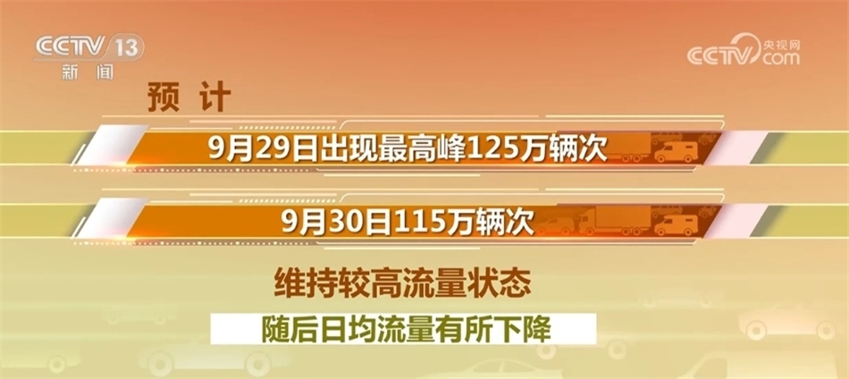 預(yù)計假期第一天,也就是今天(9月29日)出現(xiàn)最高峰125萬輛次,明天115萬輛次,維持較高流量狀態(tài),隨后日均流量有所下降。假期第七日和第八日路網(wǎng)流量將再度上升,且下午16時至19時易出現(xiàn)返程車流高峰。