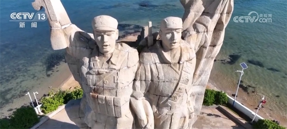 跟隨鏡頭,我們來到位于海南臨高縣北部海岸的海南解放公園,這里是解放海南渡海登陸戰(zhàn)主要登陸點之一。藍天碧海間,屹立著熱血豐碑紀念雕像,兩個戰(zhàn)士手拉著手,勝利吶喊,象征人民解放軍在瓊崖革命力量的大力配合下,創(chuàng)造戰(zhàn)爭史上“木船打軍艦”渡海作戰(zhàn)的壯舉。軍民共建,英勇無畏。