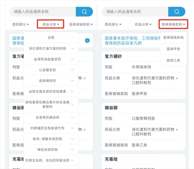 也可以根據(jù)自己的需求,選擇“藥品分類”或“醫(yī)保報銷類別”進行篩選。