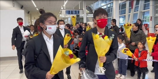 “鏗鏘玫瑰,中國加油!”當(dāng)中國隊(duì)球員走入國際到達(dá)大廳后,人群中發(fā)出整齊的助威聲。球迷們、孩子們紛紛把鮮花送給隊(duì)員們,有的與她們合影留念。當(dāng)看到主教練水慶霞走過來,大家非常熱情,把水指導(dǎo)圍在中間,送上鮮花,致以問候。