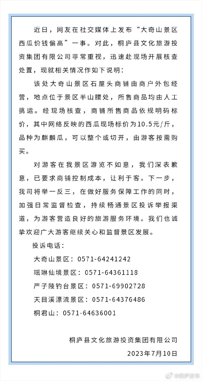 ·一游客反映大奇山景區(qū)一個(gè)西瓜賣200多元。10日,桐廬文旅集團(tuán)致歉稱,商品均由人工挑運(yùn),對(duì)游客在景區(qū)游覽不如意深表歉意,已要求商鋪控制成本,讓利于客。