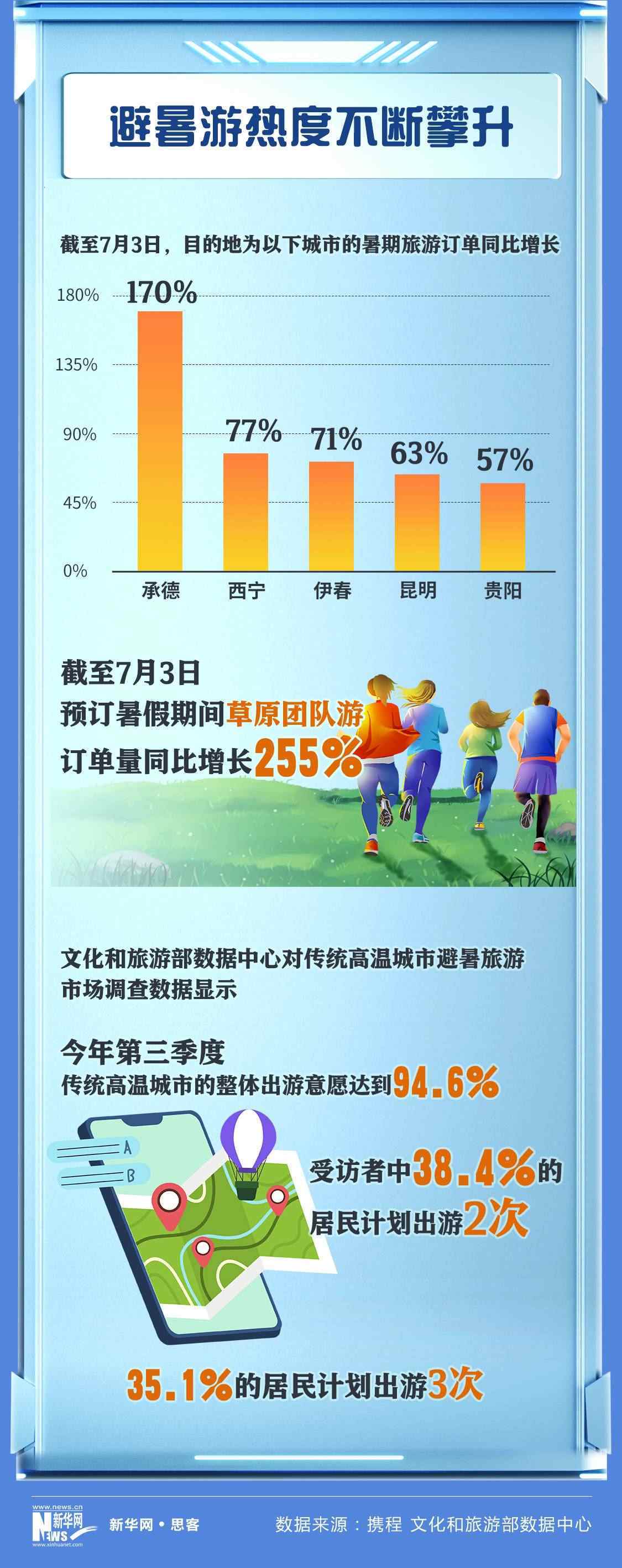 文化和旅游部數(shù)據(jù)中心不久前對傳統(tǒng)高溫城市避暑旅游市場調(diào)查數(shù)據(jù)顯示,今年第三季度傳統(tǒng)高溫城市的整體出游意愿達到94.6%,受訪者中38.4%的居民計劃出游2次,35.1%的居民計劃出游3次。