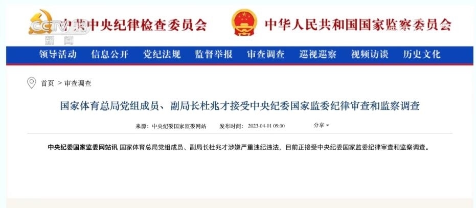 總臺央視記者 宋琎:今年3月27日,二十屆中央首輪巡視對象名單公布。“對國家體育總局黨組開展機(jī)動巡視”這一消息迅速成為社會熱點(diǎn)。之后不到一周,中央紀(jì)委國家監(jiān)委通報(bào),時(shí)任國家體育總局黨組成員、副局長杜兆才接受審查調(diào)查。體育領(lǐng)域反腐成為今年反腐敗工作的一大重點(diǎn)。