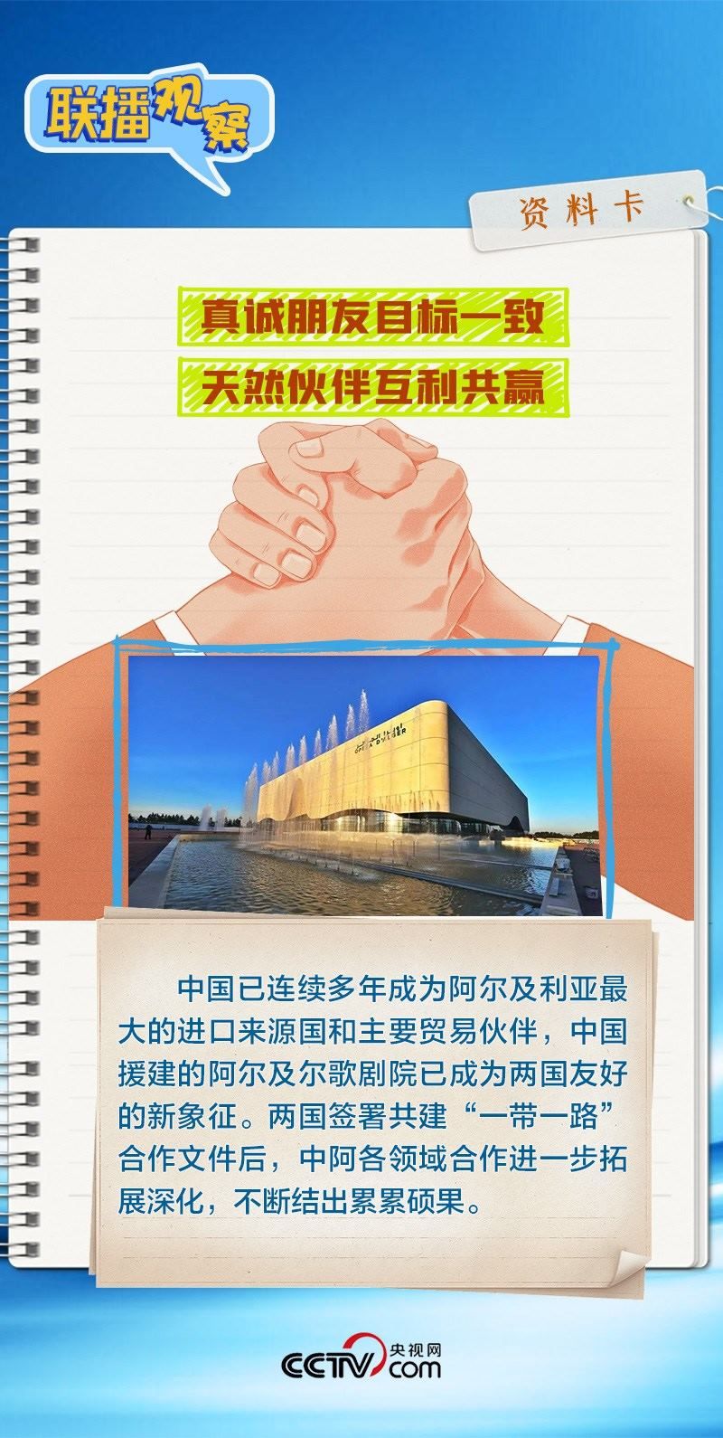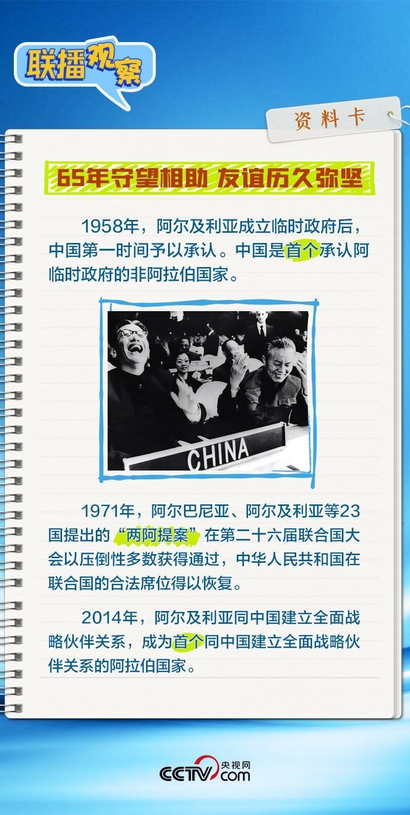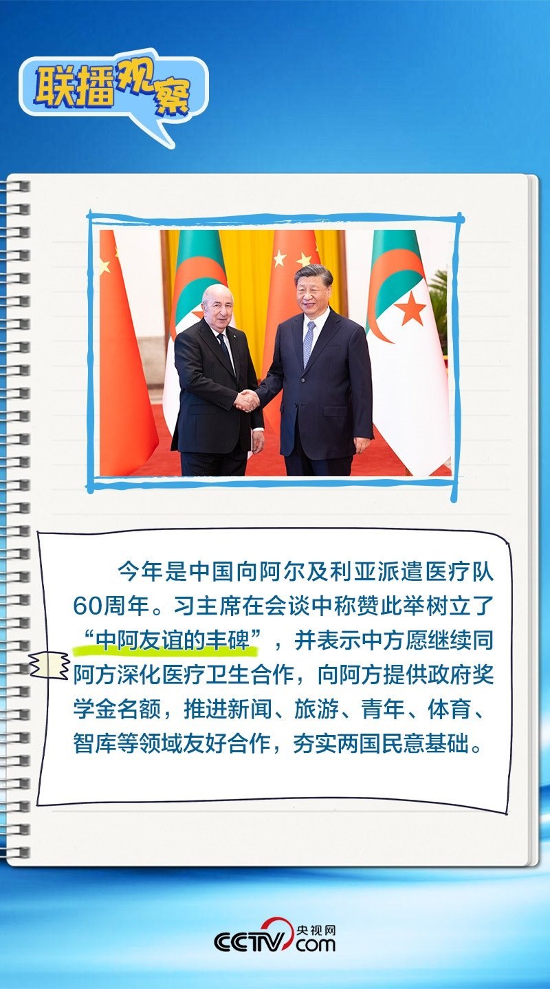 會(huì)談中,習(xí)主席特別提到,今年是中國(guó)向阿爾及利亞派遣醫(yī)療隊(duì)60周年,并稱贊此舉樹(shù)立了“中阿友誼的豐碑”。中阿傳統(tǒng)友誼深厚,兩國(guó)始終相互尊重、平等相待、彼此支持,締造了一段段友好交往的佳話。