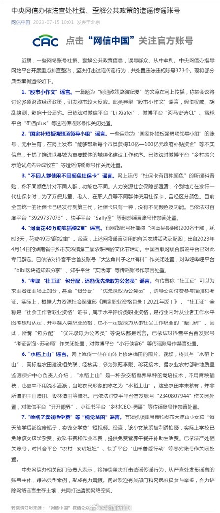 ·中央網(wǎng)信辦查處杜撰歪解公共政策造謠傳謠賬號(hào),通報(bào)典型案例,共處置違法違規(guī)賬號(hào)373個(gè)。