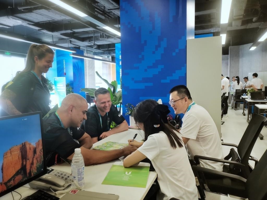 國(guó)外大學(xué)生代表團(tuán)成員在成都大運(yùn)村咨詢城市文化體驗(yàn)觀光線路活動(dòng)。受訪者供圖