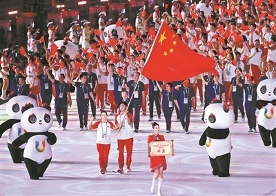 中國(guó)大學(xué)生體育代表團(tuán)運(yùn)動(dòng)員及官員,在兩位旗手郭涵煜和胡朕卓的引領(lǐng)下迎面走來(lái),全場(chǎng)掌聲雷動(dòng)。