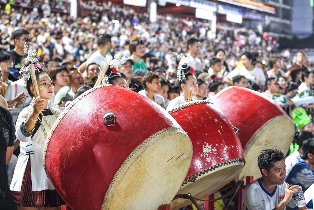 7月15日,拉拉隊在貴州“村超”足球賽場邊擊鼓助威。新華社記者 楊文斌 攝