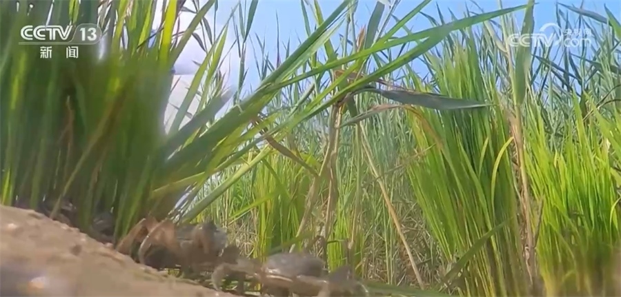 除了這群開心干活的鴨子,記者在稻田里還看到了螃蟹的身影,王千士說,起初稻田里最先養(yǎng)的是螃蟹,他想著利用螃蟹吃草吃蟲??墒屡c愿違,放進(jìn)稻田的螃蟹犯了懶,躲進(jìn)水里不干活,原來是螃蟹在邊溝里待著太舒服。第二年,王千士根據(jù)專家建議把溝挖深,同步養(yǎng)起了魚,螃蟹為了防止魚傷害自己,一個(gè)個(gè)從邊溝爬出來,進(jìn)入稻田之中。