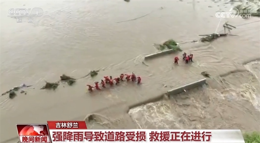 吉林省此輪最大降水量出現(xiàn)在舒蘭市永勝林場,達到489毫米。強降雨導致舒蘭多地出現(xiàn)險情,通往村屯的道路被損毀,救援人員進入村屯展開救援。