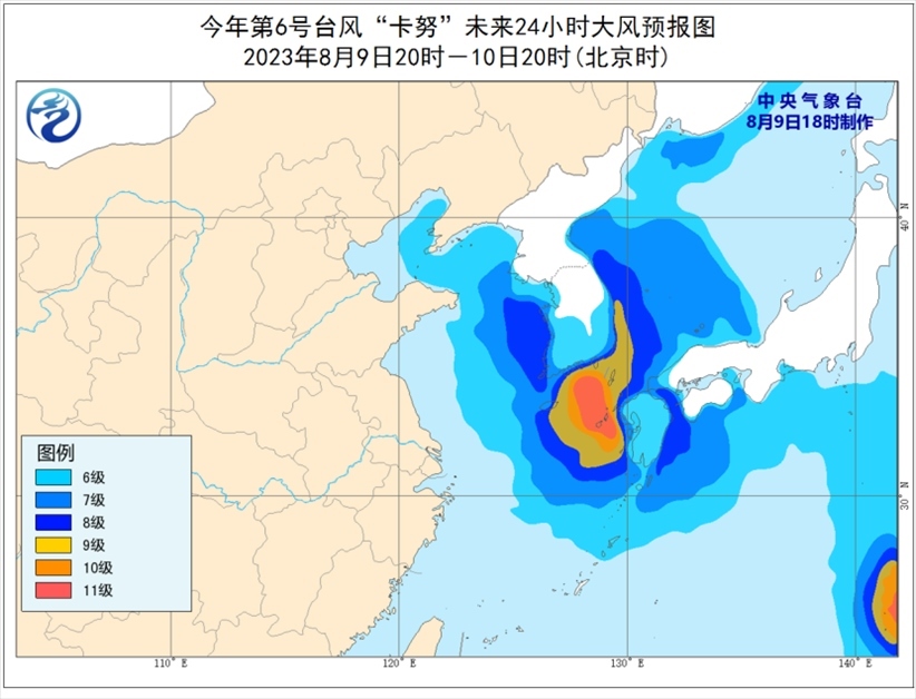9日20時(shí)至10日20時(shí),渤海東部、渤海海峽、黃海大部海域、東海東部海域?qū)⒂?-7級、陣風(fēng)8-9級的大風(fēng),其中黃海中部和南部偏東海域、東海東北部偏東海域風(fēng)力可達(dá)8-9級,“卡努”中心經(jīng)過的附近海域風(fēng)力可達(dá)10-11級、陣風(fēng)12-13級;遼東半島沿岸也將有5-6級大風(fēng),陣風(fēng)可達(dá)7-8級。
