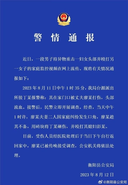 ·男子持磚砸傷妻子并毆打兒媳,湖南衡陽警方通報(bào):依法處理。