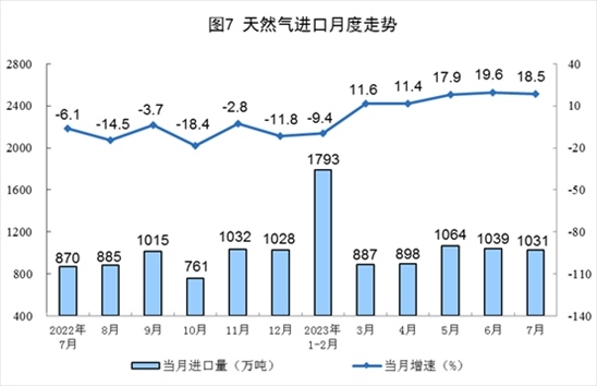 1—7月份,生產(chǎn)天然氣1340億立方米,同比增長(zhǎng)5.7%。進(jìn)口天然氣6688萬(wàn)噸,同比增長(zhǎng)7.6%。