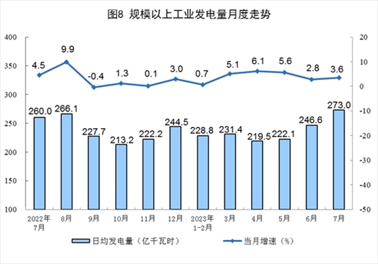 電力生產(chǎn)有所加快。7月份,發(fā)電量8462億千瓦時(shí),同比增長(zhǎng)3.6%,增速比6月份加快0.8個(gè)百分點(diǎn),日均發(fā)電273.0億千瓦時(shí)。1—7月份,發(fā)電量50130億千瓦時(shí),同比增長(zhǎng)3.8%。