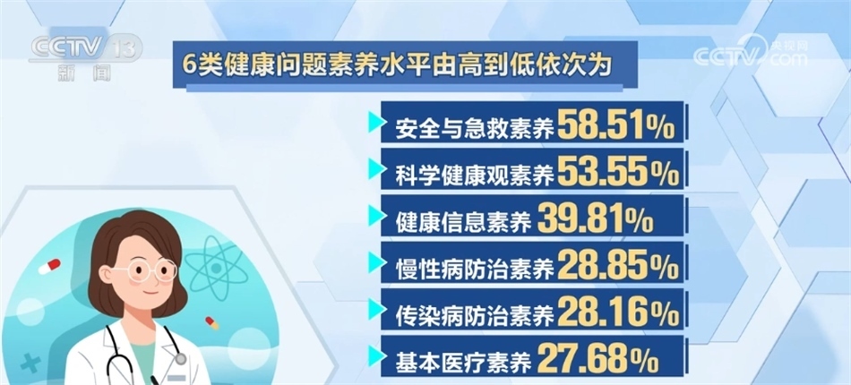 6類健康問題素養(yǎng)水平由高到低依次為:安全與急救素養(yǎng)58.51%、科學(xué)健康觀素養(yǎng)53.55%、健康信息素養(yǎng)39.81%、慢性病防治素養(yǎng)28.85%、傳染病防治素養(yǎng)28.16%和基本醫(yī)療素養(yǎng)27.68%。各類健康問題素養(yǎng)均有不同程度提升,其中,健康信息素養(yǎng)水平增幅最大,較2021年提升了3.88個百分點(diǎn)。本次監(jiān)測覆蓋31個?。ㄗ灾螀^(qū)、直轄市)的336個縣(區(qū))1008個鄉(xiāng)鎮(zhèn)(街道),對象為15—69歲常住人口。