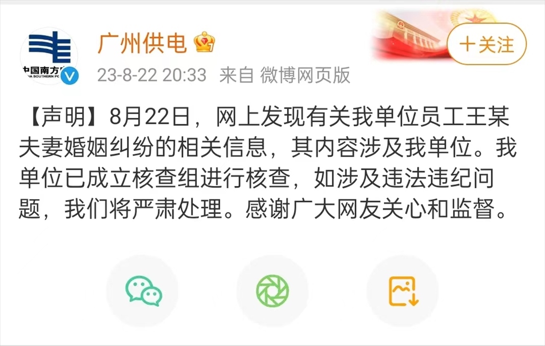 ·廣州供電局回應(yīng)員工遭妻子舉報(bào)行賄30萬(wàn)入職:已成立核查組。