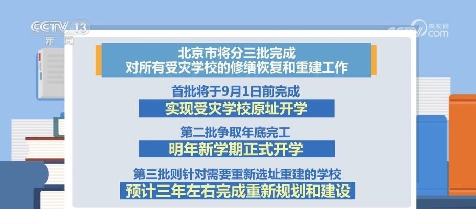 據(jù)了解,北京市將分三批完成對所有受災(zāi)學(xué)校的修繕恢復(fù)和重建工作。其中,首批將于9月1日前完成,實現(xiàn)受災(zāi)學(xué)校原址開學(xué)。第二批爭取年底完工,明年新學(xué)期正式開學(xué)。第三批則針對需要重新選址重建的學(xué)校,預(yù)計三年左右完成重新規(guī)劃和建設(shè)。