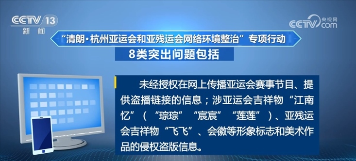 未經(jīng)授權在網(wǎng)上傳播亞運會賽事節(jié)目、提供盜播鏈接的信息;涉亞運會吉祥物“江南憶”(“琮琮”“宸宸”“蓮蓮”)、亞殘運會吉祥物“飛飛”、會徽等形象標志和美術作品的侵權盜版信息。