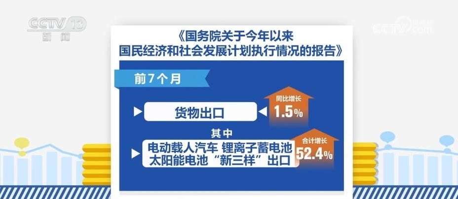 前7個(gè)月,貨物出口同比增長(zhǎng)1.5%,其中,電動(dòng)載人汽車、鋰離子蓄電池、太陽能電池“新三樣”出口合計(jì)增長(zhǎng)52.4%。