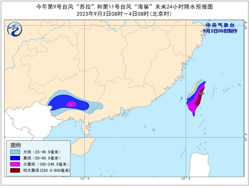 降水預報:9月3日08時至4日08時,受“蘇拉”和“??庇绊?,廣西中南部、廣東西南部、臺灣島等地部分地區(qū)有大到暴雨,其中,廣西中南部、臺灣島中東部等地部分地區(qū)有大暴雨,臺灣島東部部分地區(qū)有特大暴雨(250-600毫米)。