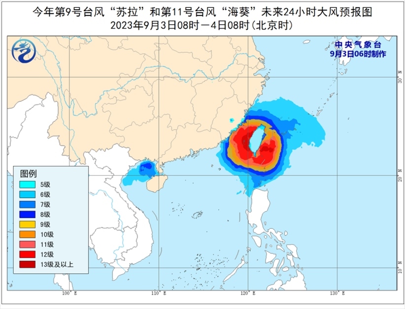 大風預報:9月3日08時至4日08時,受“蘇拉”影響,北部灣、瓊州海峽以及廣西南部沿海、海南島北部沿海等地將有6-7級大風,其中北部灣部分海域將有8級、陣風9-10級的大風;受“海葵”影響,巴士海峽、臺灣海峽、臺灣以東洋面、東海南部及釣魚島附近海域以及浙江南部沿海、福建沿海、臺灣島沿海將有6-8級、陣風9-10級大風,部分海域或地區(qū)的風力有9-12級,陣風13-14級,“??敝行慕?jīng)過的附近海面或地區(qū)的風力有13-16級,陣風17級。