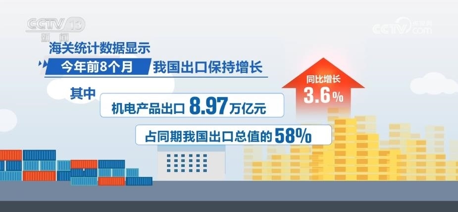 海關(guān)統(tǒng)計(jì)數(shù)據(jù)顯示,2023年前8個(gè)月,我國(guó)出口保持增長(zhǎng),其中,機(jī)電產(chǎn)品出口8.97萬(wàn)億元,同比增長(zhǎng)3.6%,占同期我國(guó)出口總值的58%;汽車及零配件、船舶、電工器材出口分別增長(zhǎng)50.1%、28%、18.6%。