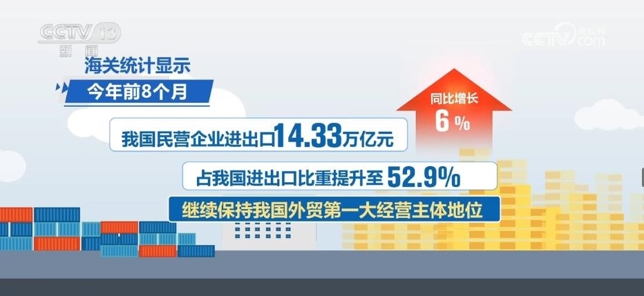 海關(guān)統(tǒng)計(jì)顯示,2023年前8個(gè)月,我國民營企業(yè)進(jìn)出口14.33萬億元,同比增長(zhǎng)6%,占我國進(jìn)出口比重提升至52.9%,繼續(xù)保持我國外貿(mào)第一大經(jīng)營主體地位。