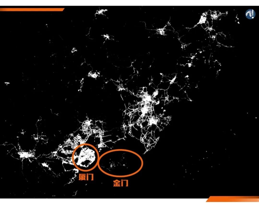 這是福建周邊的夜光遙感地圖??梢钥吹剑驮趶B門被點(diǎn)亮的時(shí)候,金門卻是一片漆黑。與此同時(shí),金門的發(fā)展也有個(gè)特點(diǎn),那就是靠近大陸的地方更亮。
