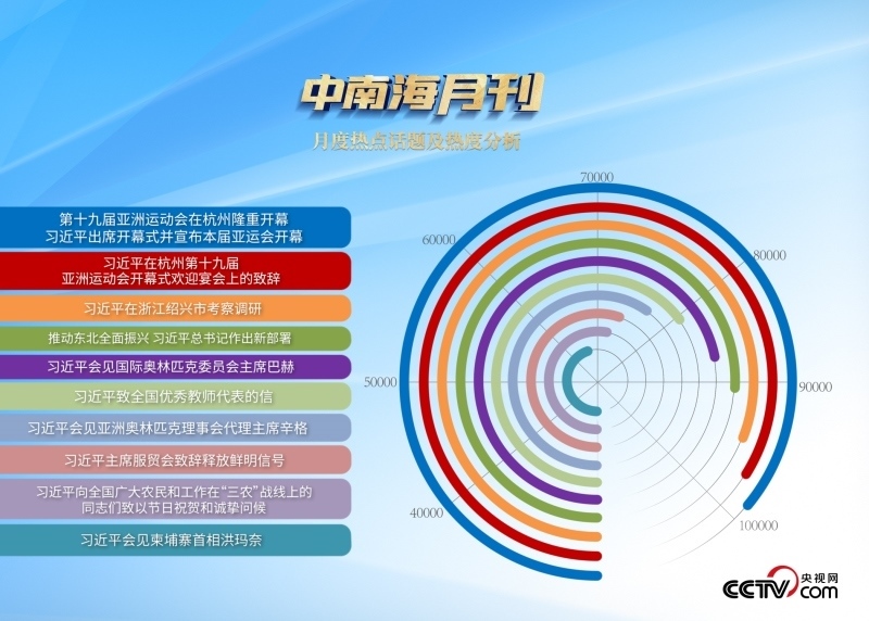 9月23日,在寓意豐收和團圓的秋分時節(jié),亞運之光映照神州大地,亞運之火點燃國人激情,綻放出健康中國的生動場景。中國以真摯的熱情歡迎亞洲體育健兒和國際貴賓,定格下四海賓朋如約而至的“杭州時刻”。央視網(wǎng)“智聞”系統(tǒng)提取分析的9月全網(wǎng)時政新聞熱點中,習近平主席在杭州亞運會期間的外交活動備受輿論關注。