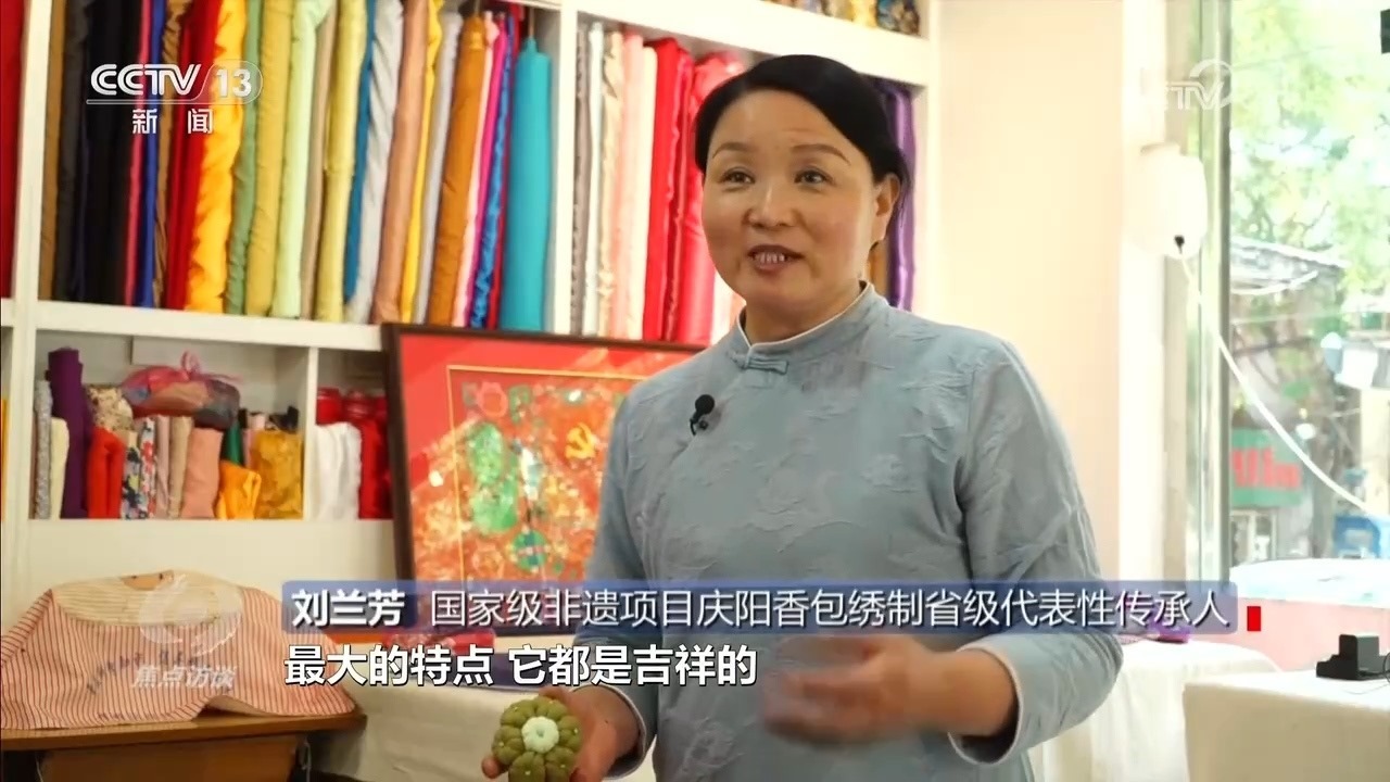 國(guó)家級(jí)非遺項(xiàng)目慶陽(yáng)香包繡制省級(jí)代表性傳承人劉蘭芳:“這個(gè)針法的特點(diǎn)是一根針一根線從頭到尾不能斷頭,要一次完成,而且左右對(duì)稱、上下對(duì)稱,我們祖祖輩輩傳承到今天。”