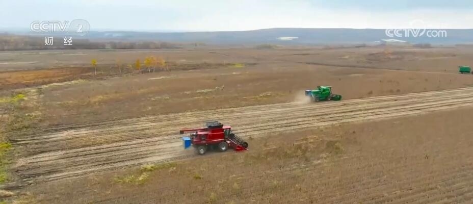 在黑河市遜克縣干岔子鄉(xiāng)的大豆收獲現(xiàn)場,金燦燦的大豆種植田連綿成片,三臺大型收割機在田間來往縱橫,井然有序。伴隨著機器的轟鳴聲,收割機將大豆收割、脫粒,然后依次轉到旁邊等候的運輸車運走。在收獲大豆的同時開展秋整地工作,兩臺大型拖拉機牽引著深松機,把收割完的土地進行深翻,改善耕地質量。