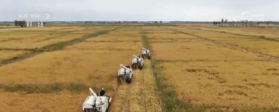 在農安縣開安鎮(zhèn)的稻田里,幾臺大型收割機編組作業(yè),往來穿梭在稻田里收割稻谷。